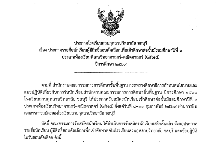 ประชาสัมพันธ์ ประกาศโรงเรียนสวนกุหลาบวิทยาลัย ชลบุรี เรื่อง ประกาศรายชื่อนักเรียนผู้มีสิทธิ์สอบเพื่อเข้าศึกษาต่อชั้นมัธยมศึกษาปีที่ 1 ประเภทห้องเรียนพิเศษวิทยาศาสตร์-คณิตศาสตร์ (Gifted) ปีการศึกษา 2569 กุมภาพันธ์ 18, 2026 suanchon ประกาศรายชื่อนั...