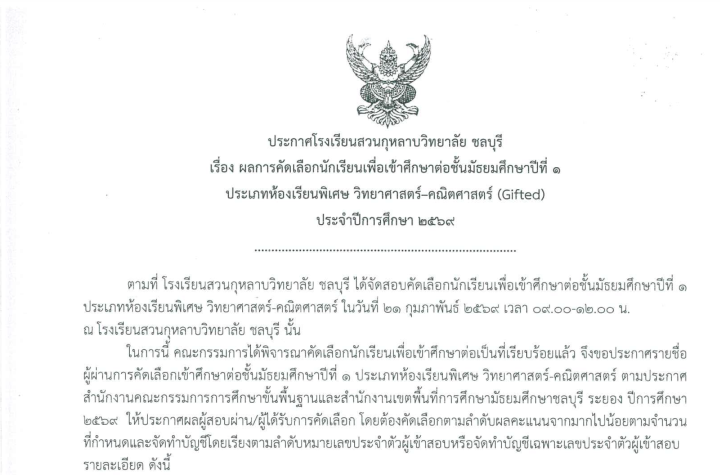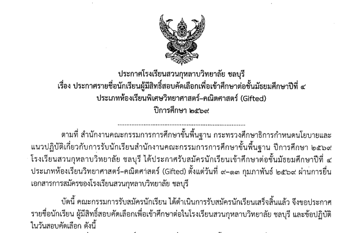 ประชาสัมพันธ์ ประกาศโรงเรียนสวนกุหลาบวิทยาลัย ชลบุรี เรื่อง ประกาศรายชื่อนักเรียนผู้มีสิทธิ์สอบเพื่อเข้าศึกษาต่อชั้นมัธยมศึกษาปีที่ 4 ประเภทห้องเรียนพิเศษวิทยาศาสตร์-คณิตศาสตร์ (Gifted) ปีการศึกษา 2569 กุมภาพันธ์ 18, 2026 suanchon ประกาศรายชื่อนั...