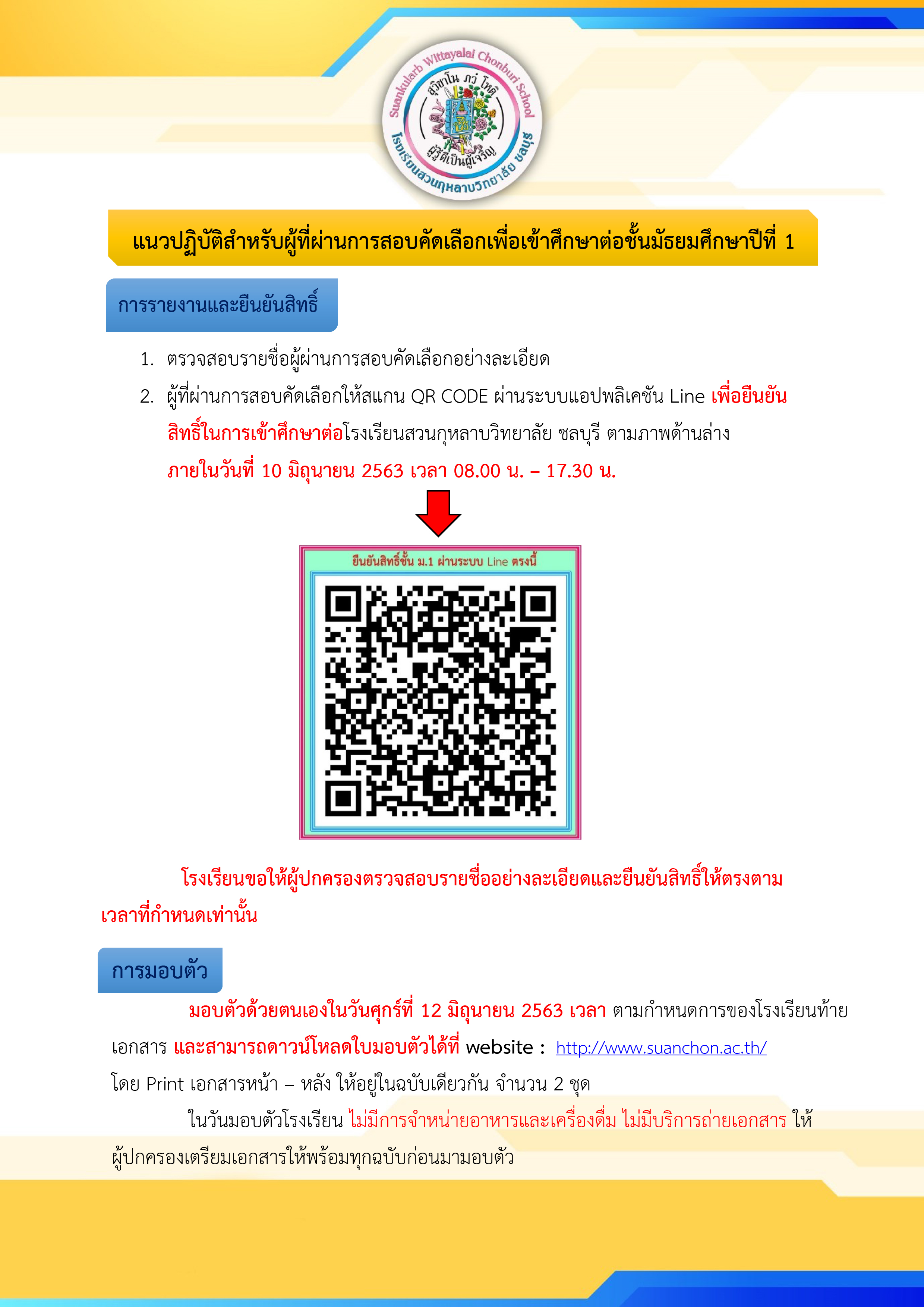 ประชาสัมพันธ์ ประกาศ ! ผลการคัดเลือกนักเรียนชั้นมัธยมศึกษาปีที่ 1 ปีการศึกษา 2563 suanchon มิถุนายน 10, 2020 รายชื่อผู้ผ่านการคัดเลือกชั้นมัธยมศึกษาปีที่ 1 เอกสารมอบตัวนักเรียนชั้นมัธยมศึกษาปีที่ 1 รายงานตัวยืนยันสิทธิ์ระดับชั้นมัธยมศึกษาปีที่ 1 Post navigation Previous ประกาศ!! การสอบคัดเลือกนักเรียนใหม่ ปีการศึกษา 2563Next ประกาศ ! ผลการคัดเลือกนักเรียนชั้นมัธยมศึกษาปีที่ 4 และนักเรียนกลางคัน ปีการศึกษา 2563 More Stories 1 min read ประชาสัมพันธ์ ประกาศโรงเรียนสวนกุหลาบวิทยาลัย ชลบุรี เรื่อง รับสมัครบุคคลเพื่อสรรหาเป็นพนักงานทั่วไป สิงหาคม 13, 2025 suanchon 1 min read ประชาสัมพันธ์ ประกาศโรงเรียนสวนกุหลาบวิทยาลัย ชลบุรี เรื่อง รับสมัครบุคคลเพื่อสรรหาเป็นพนักงานทั่วไป กรกฎาคม 29, 2025 suanchon 1 min read ประชาสัมพันธ์ ประกาศโรงเรียนสวนกุหลาบวิทยาลัย ชลบุรี เรื่อง การใช้มาตรฐานการศึกษาของสถานศึกษา ระดับการศึกษาขั้นพื้นฐาน เพื่อการประกันคุณภาพภายในของสถานศึกษา ปีการศึกษา ๒๕๖๘ มิถุนายน 20, 2025 suanchon