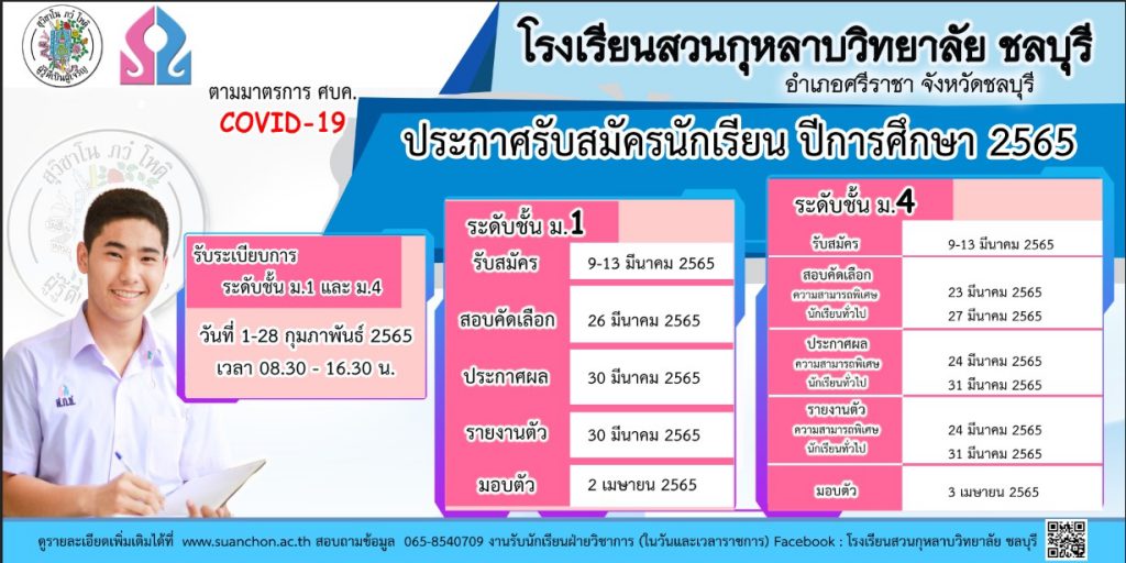 ประชาสัมพันธ์ การรับนักเรียนเข้าศึกษาต่อชั้นมัธยมศึกษาปีที่ 1 และชั้นมัธยมศึกษาปีที่ 4 ปีการศึกษา 2565 suanchon มกราคม 24, 2022 1 min read <span data-mce-type=”bookmark” style=”display: inline-block; width: 0px; overflow: hidden; line-height: 0;” class=”mce_SELRES_start”></span><span data-mce-type=”bookmark” style=”display: inline-block; width: 0px; overflow: hidden; line-height: 0;” class=”mce_SELRES_start”></span><span data-mce-type=”bookmark” style=”display: inline-block; width: 0px; overflow: hidden; line-height: 0;” class=”mce_SELRES_start”></span><span data-mce-type=”bookmark” style=”display: inline-block; width: 0px; overflow: hidden; line-height: 0;” class=”mce_SELRES_start”></span><span data-mce-type=”bookmark” style=”display: inline-block; width: 0px; overflow: hidden; line-height: 0;” class=”mce_SELRES_start”></span><span data-mce-type=”bookmark” style=”display: inline-block; width: 0px; overflow: hidden; line-height: 0;” class=”mce_SELRES_start”></span> Post navigation Previous ผลการคัดเลือกนักเรียนโควตาเพื่อเข้าเรียนต่อชั้นมัธยมศึกษาปีที่ 4 ปีการศึกษา 2565Next ประกาศการเปิดเรียนแบบ Onsite แบบสลับกลุ่ม More Stories 1 min read ประชาสัมพันธ์ ประกาศโรงเรียนสวนกุหลาบวิทยาลัย ชลบุรี เรื่อง รับสมัครบุคคลเพื่อสรรหาเป็นพนักงานทั่วไป สิงหาคม 13, 2025 suanchon 1 min read ประชาสัมพันธ์ ประกาศโรงเรียนสวนกุหลาบวิทยาลัย ชลบุรี เรื่อง รับสมัครบุคคลเพื่อสรรหาเป็นพนักงานทั่วไป กรกฎาคม 29, 2025 suanchon 1 min read ประชาสัมพันธ์ ประกาศโรงเรียนสวนกุหลาบวิทยาลัย ชลบุรี เรื่อง การใช้มาตรฐานการศึกษาของสถานศึกษา ระดับการศึกษาขั้นพื้นฐาน เพื่อการประกันคุณภาพภายในของสถานศึกษา ปีการศึกษา ๒๕๖๘ มิถุนายน 20, 2025 suanchon
