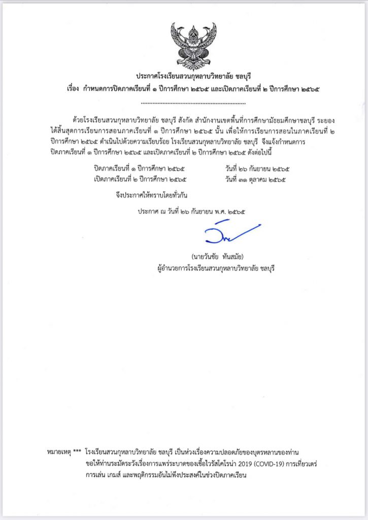 ประกาศกำหนดการเปิด-ปิดภาคเรียน ปีการศึกษา 2565