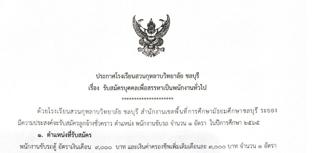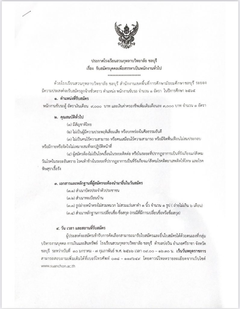 ประกาศโรงเรียนสวนกุหลาบวิทยาลัย ชลบุรี เรื่อง รับสมัครบุคคลเพื่อสรรหาเป็นพนักงานทั่วไป