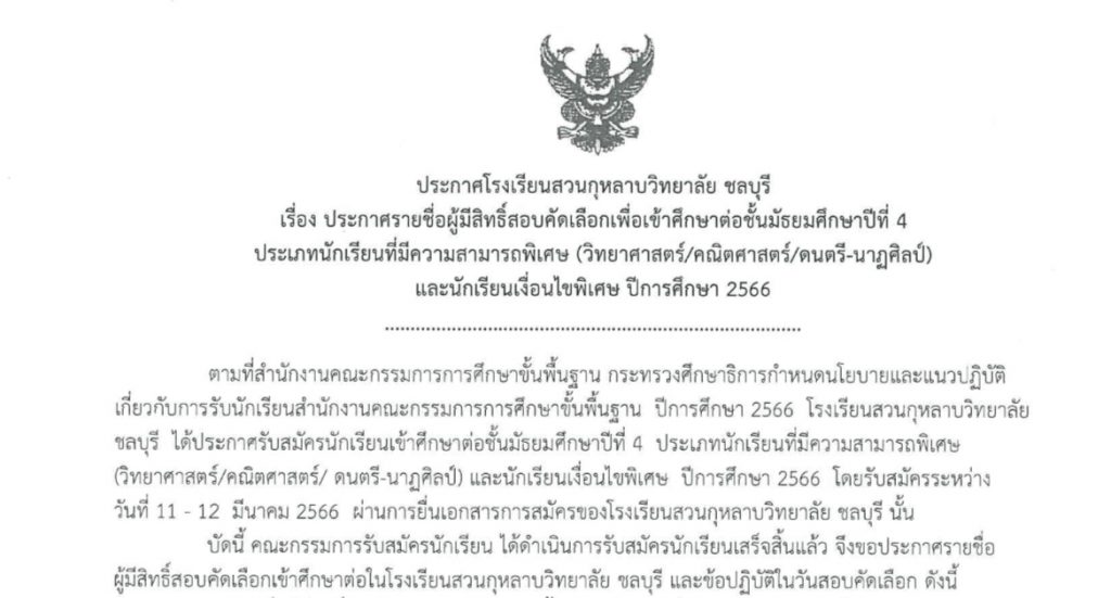 ประกาศรายชื่อผู้มีสิทธิ์สอบคัดเลือกเพื่อเข้าศึกษาต่อระดับชั้นมัธยมศึกษาปีที่ 4 ประเภทนักเรียนที่มีความสามารถพิเศษ และนักเรียนเงื่อนไขพิเศษ