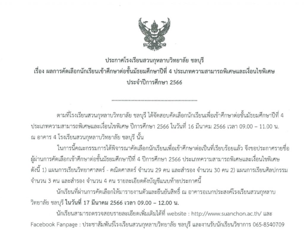 ประชาสัมพันธ์ ประกาศผลการคัดเลือกเข้าศึกษาต่อ ม.4 (ความสามารถพิเศษ) suanchon มีนาคม 16, 2023 ประกาศรายชื่อ Post navigation Previous ประกาศรายชื่อผู้มีสิทธิ์สอบคัดเลือกเพื่อเข้าศึกษาต่อระดับชั้นมัธยมศึกษาปีที่ 4 ประเภทนักเรียนที่มีความสามารถพิเศษ และนักเรียนเงื่อนไขพิเศษNext ประกาศรายชื่อผู้มีสิทธิ์สอบคัดเลือกเข้าศึกษา ระดับชั้น ม.1 – 6 ปีการศึกษา 2566 More Stories 1 min read ประชาสัมพันธ์ ประกาศโรงเรียนสวนกุหลาบวิทยาลัย ชลบุรี เรื่อง รับสมัครบุคคลเพื่อสรรหาเป็นพนักงานทั่วไป สิงหาคม 13, 2025 suanchon 1 min read ประชาสัมพันธ์ ประกาศโรงเรียนสวนกุหลาบวิทยาลัย ชลบุรี เรื่อง รับสมัครบุคคลเพื่อสรรหาเป็นพนักงานทั่วไป กรกฎาคม 29, 2025 suanchon 1 min read ประชาสัมพันธ์ ประกาศโรงเรียนสวนกุหลาบวิทยาลัย ชลบุรี เรื่อง การใช้มาตรฐานการศึกษาของสถานศึกษา ระดับการศึกษาขั้นพื้นฐาน เพื่อการประกันคุณภาพภายในของสถานศึกษา ปีการศึกษา ๒๕๖๘ มิถุนายน 20, 2025 suanchon