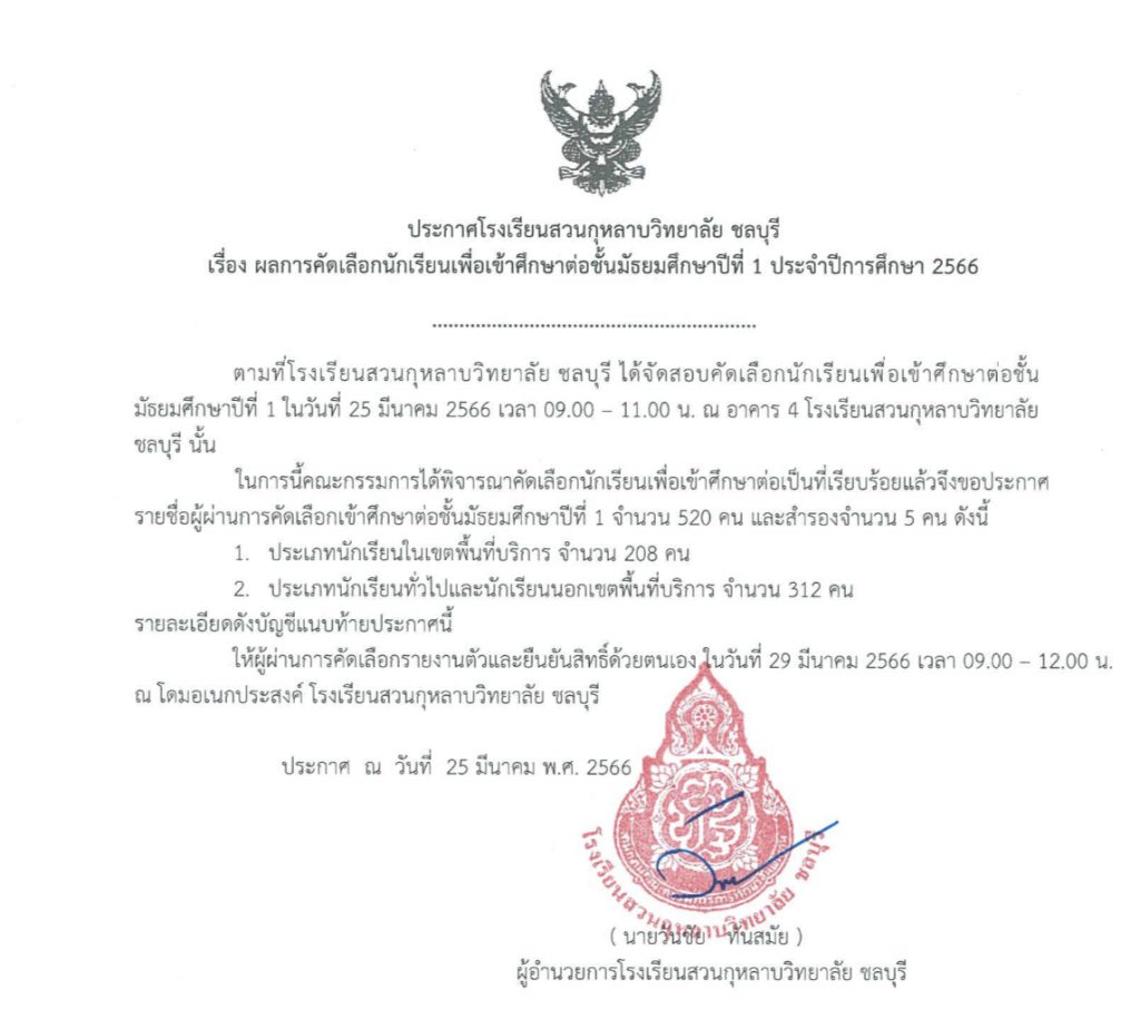 ประชาสัมพันธ์ ประกาศผลการคัดเลือกนักเรียน เข้าศึกษาต่อระดับชั้น ม.1 ปีการศึกษา 2566 suanchon มีนาคม 25, 2023 Post navigation Previous ประกาศรายชื่อผู้มีสิทธิ์สอบคัดเลือกเข้าศึกษา ระดับชั้น ม.1 – 6 ปีการศึกษา 2566Next ประกาศผลการสอบคัดเลือกนักเรียนเข้าศึกษาต่อชั้นมัธยมศึกษาปีที่ 2, 3, 5, 6 ปีการศึกษา 2566 More Stories 1 min read ประชาสัมพันธ์ ประกาศโรงเรียนสวนกุหลาบวิทยาลัย ชลบุรี เรื่อง รับสมัครบุคคลเพื่อสรรหาเป็นพนักงานทั่วไป สิงหาคม 13, 2025 suanchon 1 min read ประชาสัมพันธ์ ประกาศโรงเรียนสวนกุหลาบวิทยาลัย ชลบุรี เรื่อง รับสมัครบุคคลเพื่อสรรหาเป็นพนักงานทั่วไป กรกฎาคม 29, 2025 suanchon 1 min read ประชาสัมพันธ์ ประกาศโรงเรียนสวนกุหลาบวิทยาลัย ชลบุรี เรื่อง การใช้มาตรฐานการศึกษาของสถานศึกษา ระดับการศึกษาขั้นพื้นฐาน เพื่อการประกันคุณภาพภายในของสถานศึกษา ปีการศึกษา ๒๕๖๘ มิถุนายน 20, 2025 suanchon