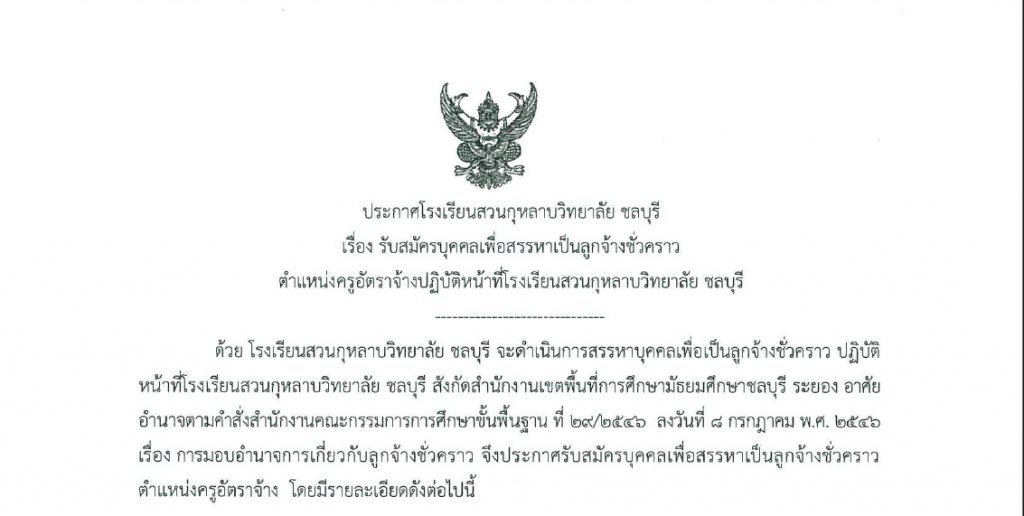 ประกาศโรงเรียนสวนกุหลาบวิทยาลัย ชลบุรี เรื่อง รับสมัครบุคคลเพื่อสรรหาเป็นพนักงานทั่วไป