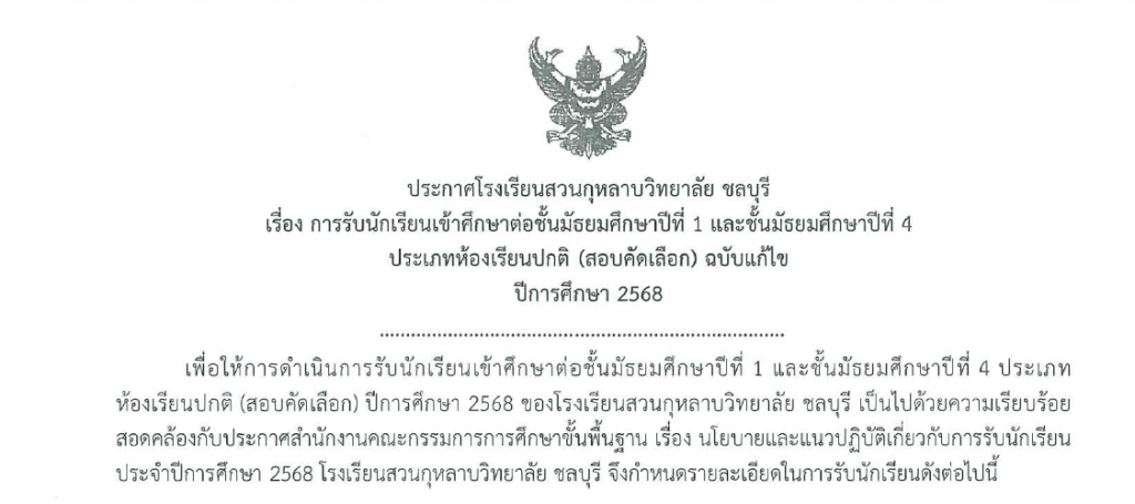 ประกาศโรงเรียนสวนกุหลาบวิทยาลัย ชลบุรี เรื่อง การใช้มาตรฐานการศึกษาของสถานศึกษา ระดับการศึกษาขั้นพื้นฐาน เพื่อการประกันคุณภาพภายในของสถานศึกษา ปีการศึกษา ๒๕๖๘