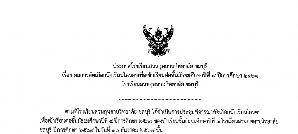ประกาศผลการคัดเลือกนักเรียนโควตาเพื่อเข้าเรียนต่อชั้นมัธยมศึกษาปีที่ 4 ปีการศึกษา 2568