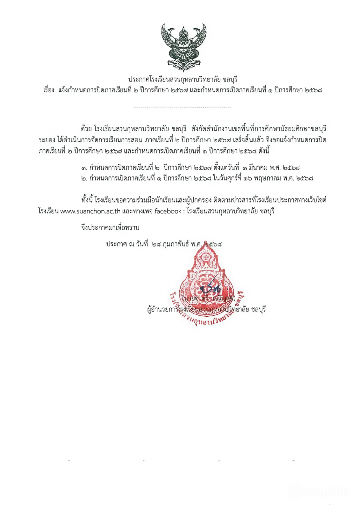 ประกาศโรงเรียนสวนกุหลาบวิทยาลัย ชลบุรี เรื่อง การใช้มาตรฐานการศึกษาของสถานศึกษา ระดับการศึกษาขั้นพื้นฐาน เพื่อการประกันคุณภาพภายในของสถานศึกษา ปีการศึกษา ๒๕๖๘