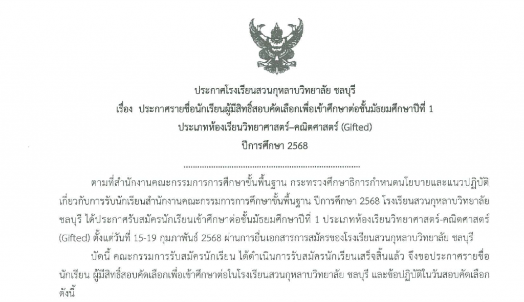 ประกาศโรงเรียนสวนกุหลาบวิทยาลัย ชลบุรี เรื่อง การใช้มาตรฐานการศึกษาของสถานศึกษา ระดับการศึกษาขั้นพื้นฐาน เพื่อการประกันคุณภาพภายในของสถานศึกษา ปีการศึกษา ๒๕๖๘