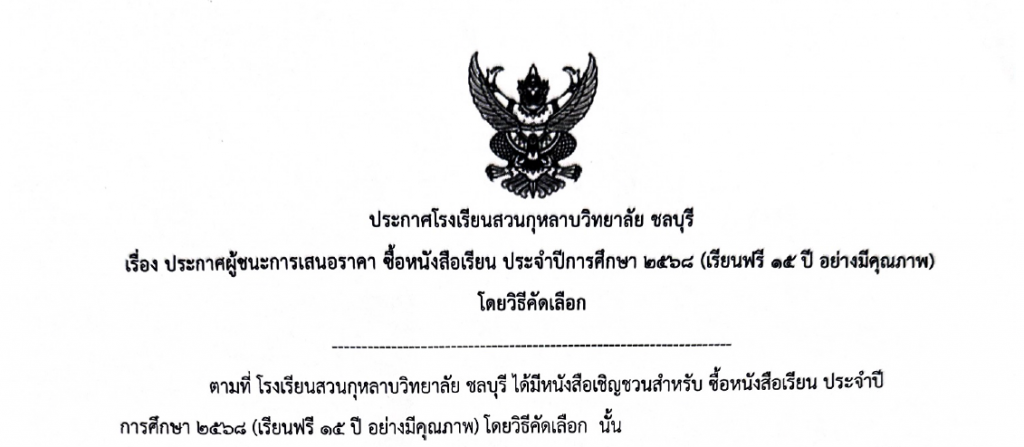 ประกาศผู้ชนะการเสนอราคา ซื้อหนังสือเรียน ประจำปีการศึกษา 2568 (เรียนฟรี 15 ปี อย่างมีคุณภาพ) โดยวิธีคัดเลือก