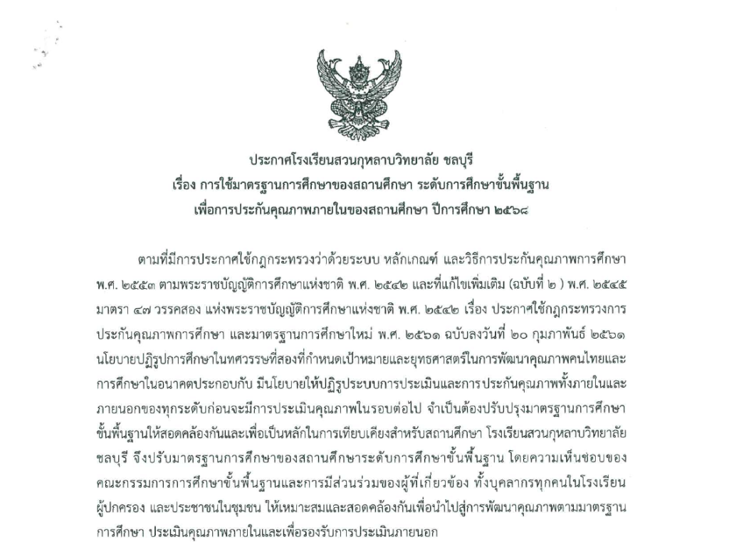 ประกาศโรงเรียนสวนกุหลาบวิทยาลัย ชลบุรี เรื่อง การใช้มาตรฐานการศึกษาของสถานศึกษา ระดับการศึกษาขั้นพื้นฐาน เพื่อการประกันคุณภาพภายในของสถานศึกษา ปีการศึกษา ๒๕๖๘