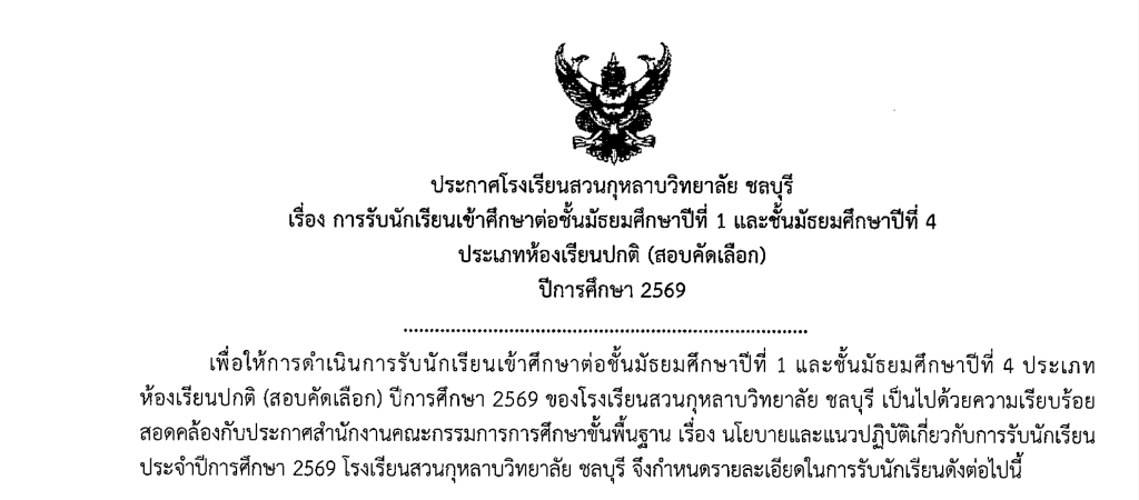 ประกาศโรงเรียนสวนกุหลาบวิทยลัย ชลบุรี เรื่อง การรับนักเรียนเข้าศึกษาต่อชั้นมัธยมศึกษาปีที่ 1 และมัธยมศึกษาปีที่ 4 ประเภทห้องเรียนวิทยาศาสตร์-คณิตศาสตร์ (Gifted) ปีการศึกษา 2569