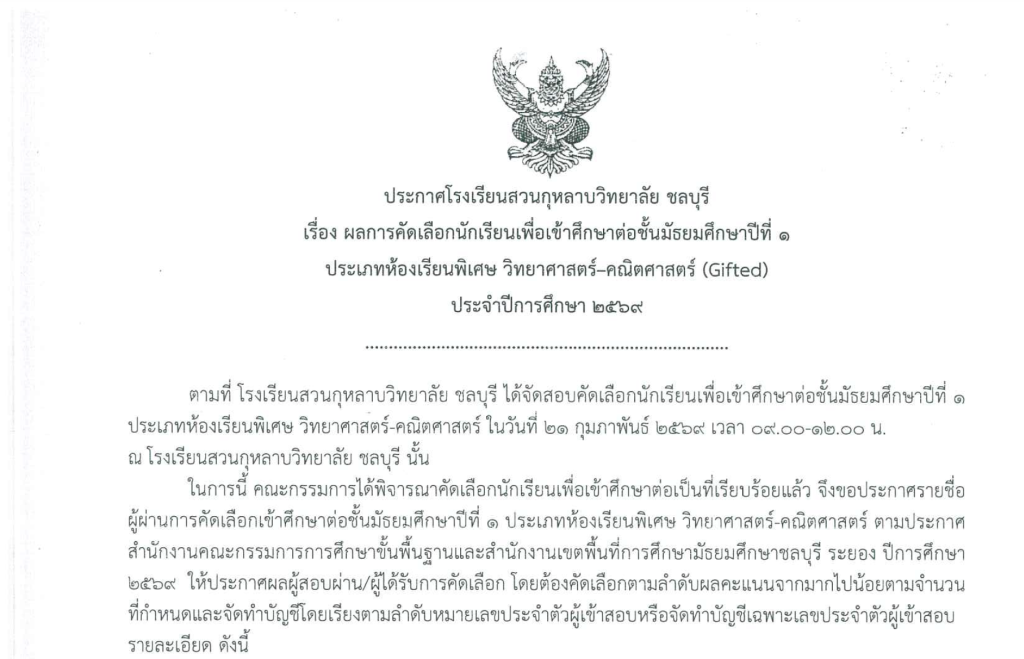 ประกาศโรงเรียนสวนกุหลาบวิทยาลัย ชลบุรี เรื่อง ประกาศรายชื่อนักเรียนผู้มีสิทธิ์สอบเพื่อเข้าศึกษาต่อชั้นมัธยมศึกษาปีที่ 1 ประเภทห้องเรียนพิเศษวิทยาศาสตร์-คณิตศาสตร์ (Gifted) ปีการศึกษา 2569