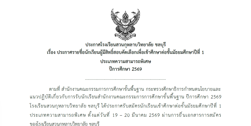 ประกาศโรงเรียนสวนกุหลาบวิทยาลัย ชลบุรี เรื่อง ประกาศรายชื่อนักเรียนผู้มีสิทธิ์สอบคัดเลือกเพื่อเข้าศึกษาต่อชั้นมัธยมศึกษาปีที่ 1 ประเภทความสามารถพิเศษปีการศึกษา 2569