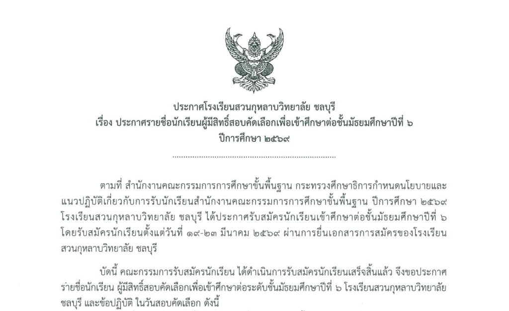 ประกาศโรงเรียนสวนกุหลาบวิทยาลัย ชลบุรี เรื่อง ประกาศรายชื่อนักเรียนผู้มีสิทธิ์สอบคัดเลือกเพื่อเข้าศึกษาต่อชั้นมัธยมศึกษาปีที่ 6 ประจำปีการศึกษา 2569