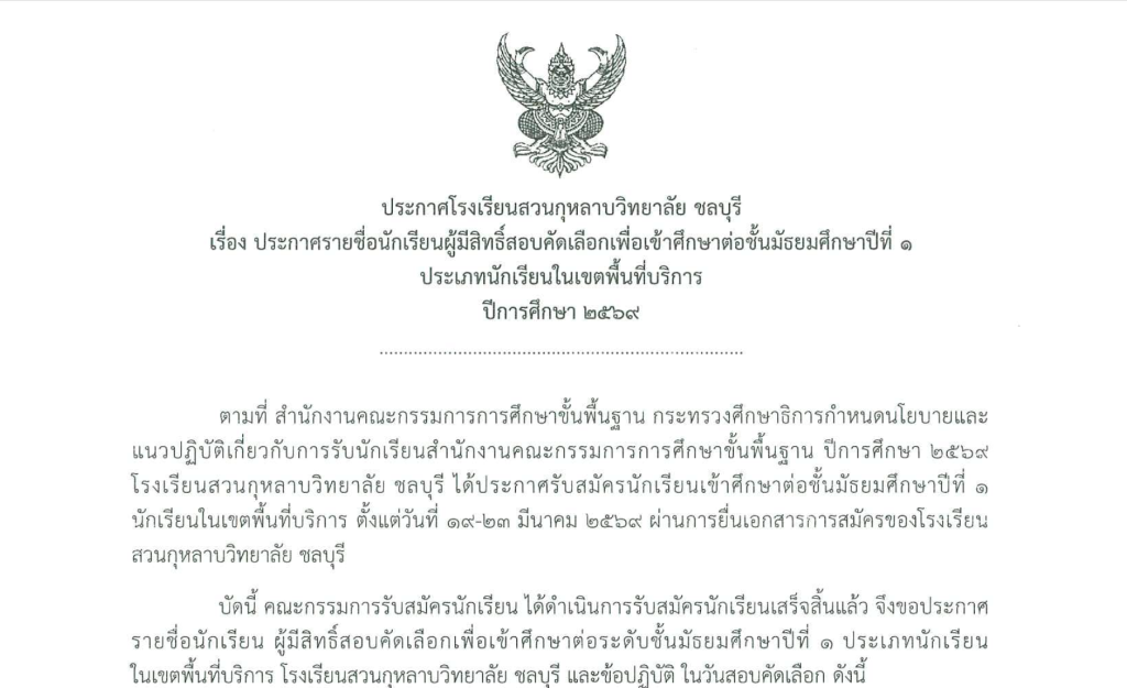 ประกาศโรงเรียนสวนกุหลาบวิทยาลัย ชลบุรี เรื่อง ประกาศรายชื่อนักเรียนผู้มีสิทธิ์สอบคัดเลือกเพื่อเข้าศึกษาต่อชั้นมัธยมศึกษาปีที่ 1 ประเภทนักเรียนในเขตพื้นที่บริการ ประจำปีการศึกษา 2569