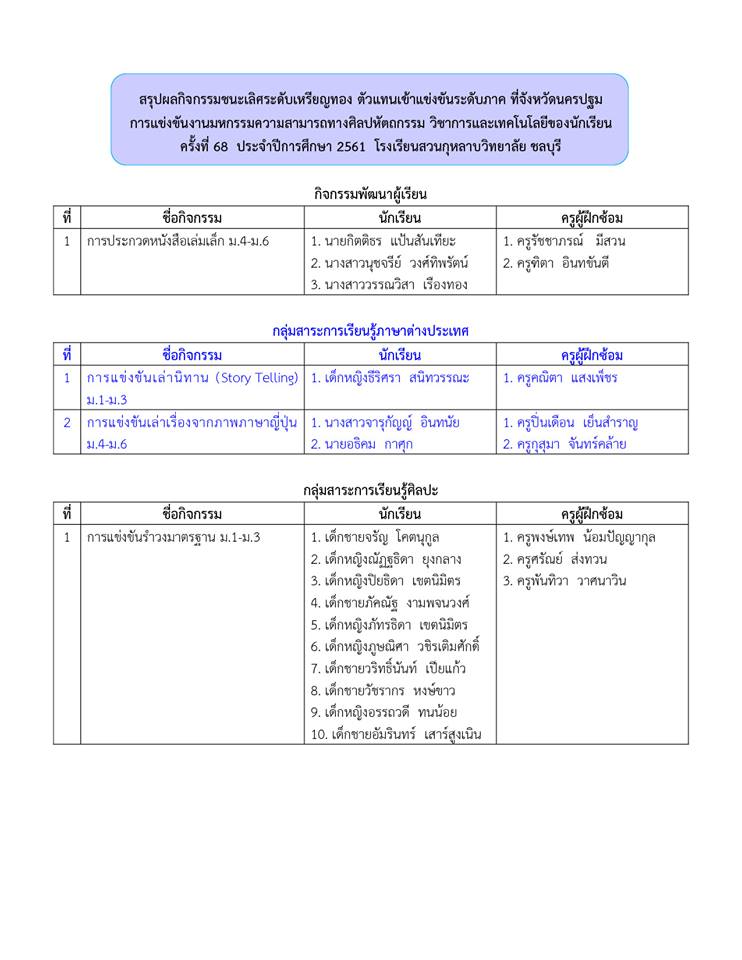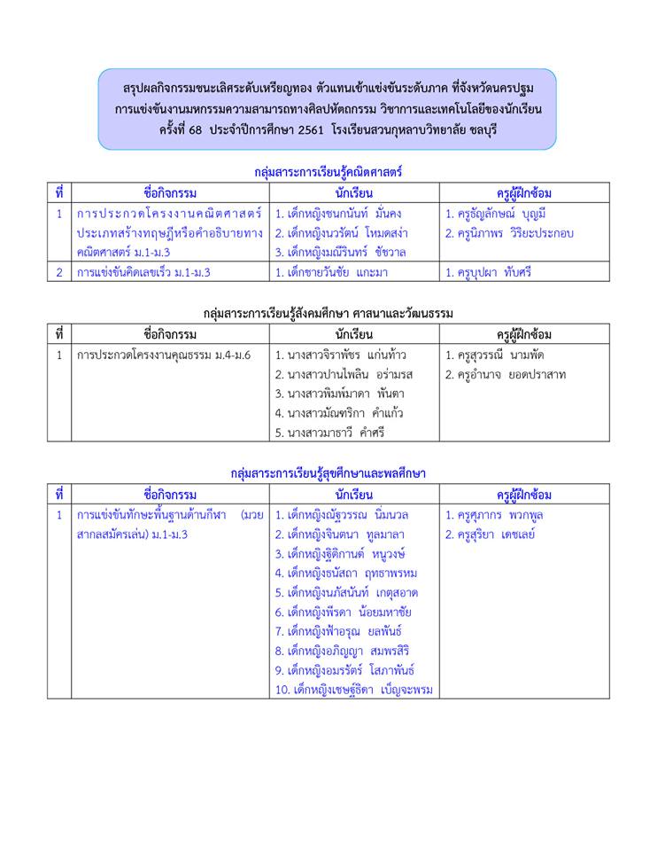 สรุปผลกิจกรรมชนะเลิศระดับเหรียญทอง ตัวแทนนักเรียนโรงเรียนสวนกุหลาบวิทยาลัย ชลบุรี เข้าแข่งขันต่อระดับภาค ที่จังหวัดนครปฐม งานมหกรรมความสามารถทางศิลปหัตถกรรม วิชาการและเทคโนโลยีของนักเรียน ครั้งที่ 68 ปีการศึกษา 2561