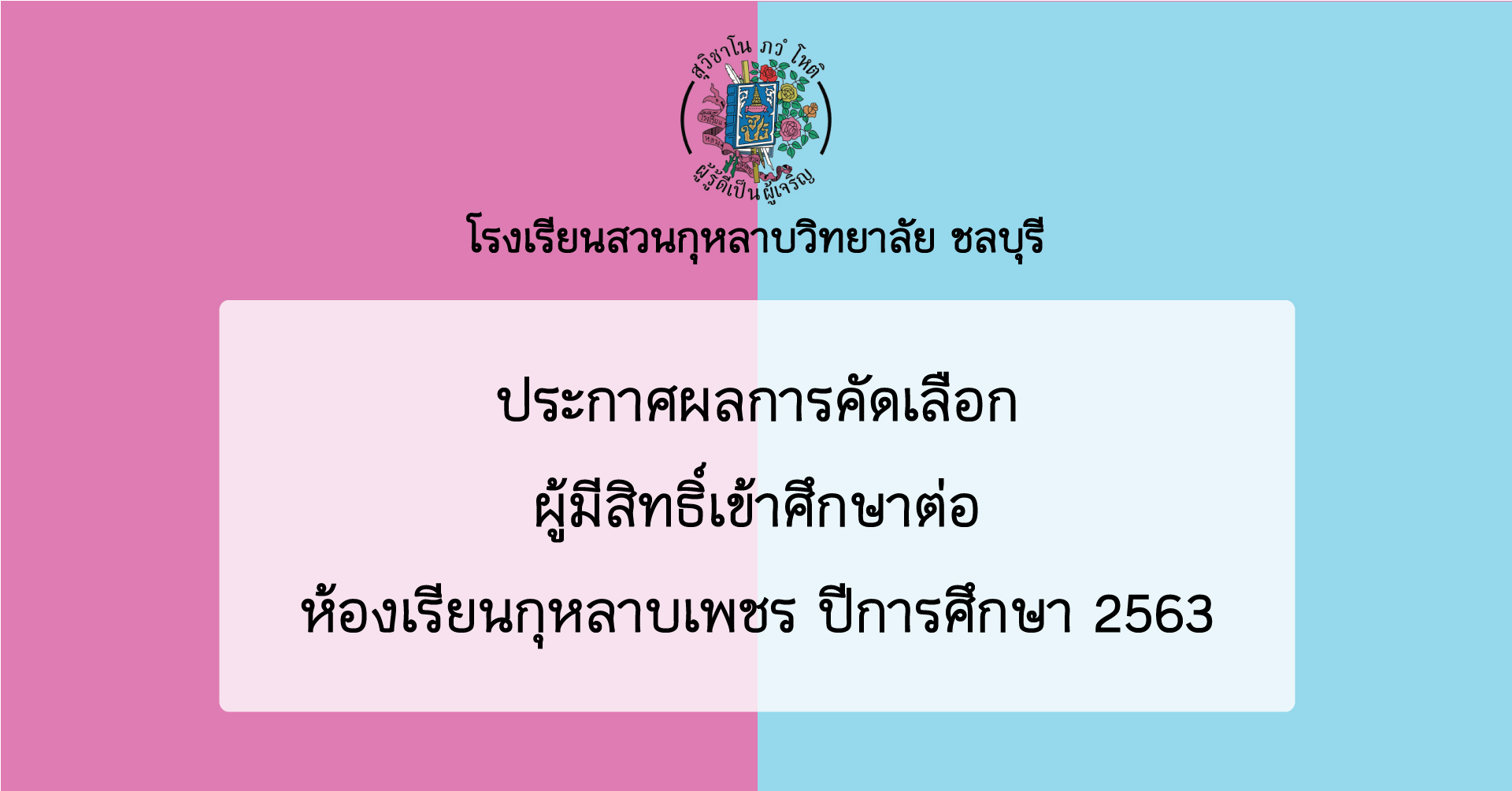 ประชาสัมพันธ์ ประกาศ !! ผลการคัดเลือกผู้มีสิทธิ์เข้าศึกษาห้องเรียนกุหลาบเพชร ปีการศึกษา 2563 มีนาคม 9, 2020 suanchon ระดับชั้นมัธยมศ...